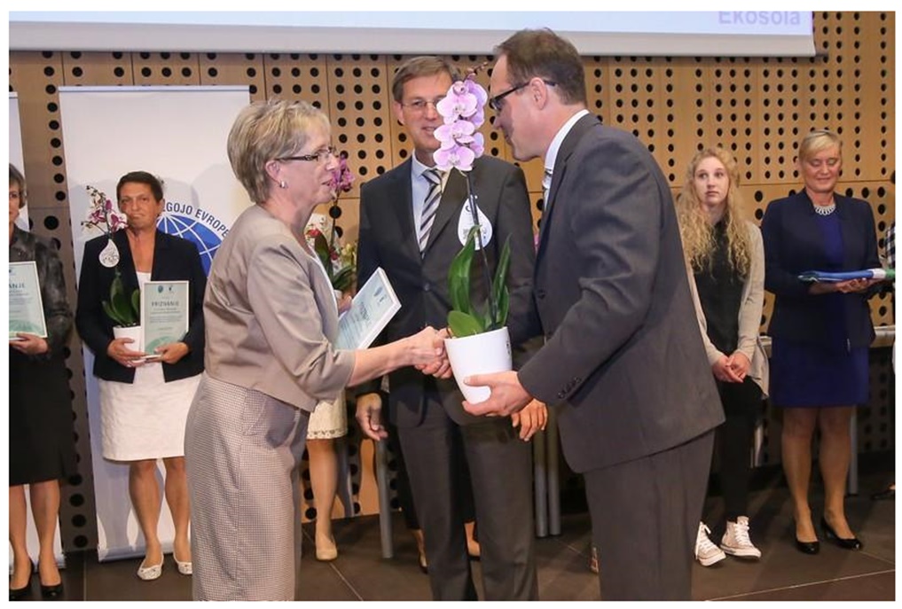Osnovna šola Antona Žnideršiča je že 20 let ekošola. Septembra je ravnateljica Karmen Šepec prevzela posebno priznanje.
