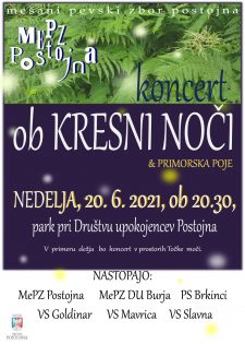 Mešani pevski zbor Postojna bo Kresni koncert odpel jutri ob 20.30 v parku pri Društvu upokojencev Postojna. Pridružile se mu bodo tudi druge pevske skupine, saj bo koncert del prilagojene revije Primorska poje.