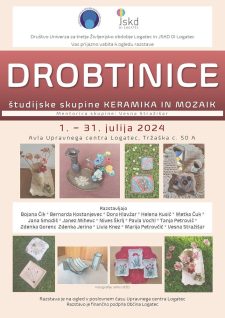 V avli Upravnega centra Logatec je do konca meseca na ogled razstava Drobtinice Študijske skupine Keramika in mozaik, ki deluje pri Univerzi za tretje življenjsko obdobje Logatec pod vodstvom Vesne Stražišar.