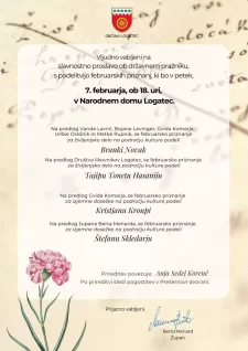 Osrednja občinska slovesnost ob slovenskem kulturnem prazniku bo danes ob 18. uri v Narodnem domu Logatec. Logaška občina je med tistimi lokalnimi skupnostmi, ki ob 8. februarju podeljujejo priznanja s področja kulture. Letos bodo zaploskali štirim prejemnikom: Branki Novak, Tonetu Tajipu Hasaniju, Kristjanu Kroupi in Štefanu Skledarju.
