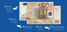 »V večini primerov zadošča že to, da bankovce dobro pogledate in pretipate ter jih obrnete proti svetlobi, saj so zaščitni elementi tako opaznejši. Pozorni bodite na relief, saj ga ponaredki navadno nimajo. Pri pregledu pristnega bankovca proti svetlobi sta vidna portretni vodni znak in varnostna nit, pri večjih vrednostih tudi portretno okence. Pri nagibanju bankovca naprej in nazaj se na srebrnem traku opazi prelivanje simbola evra, arhitekturnega motiva, vrednosti bankovca. Na hrbtni strani se vidi zlatorumen trak (na bankovcih za 5, 10 in 20 evrov) in številko spremenljive barve (na bankovcih za 50 , 100 , 200 in 500 evrov),« razlaga Policija.