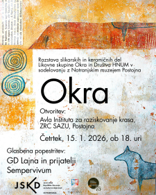 Likovna skupina Okra in Društvo HNUM bosta v sodelovanju z Notranjskim muzejem Postojna jutri ob 18. uri razstavila svoja slikarska in keramična dela v avli Inštituta za raziskovanje krasa ZRC SAZU v Postojni.
