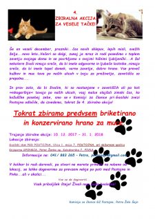 Komisija za članice pri Gasilski zvezi Postojna že četrto leto zapored organizira zbiralno akcijo za domače  živali, ki so nastanjene v zavetiščih ali so prostoživeče. Gasilke bodo letos pomagale predvsem mačkam. Predsednica komisije za delo s članicami pri Gasilci zvezi Postojna  Petra Žele Šajn je povedala, da bodo zbrano hrano podarile Društvu za zaščito živali Postojna. Zbiralna akcija v gasilskem domu Postojna in Knjigarni Sponkca v Pivki traja do konca leta.